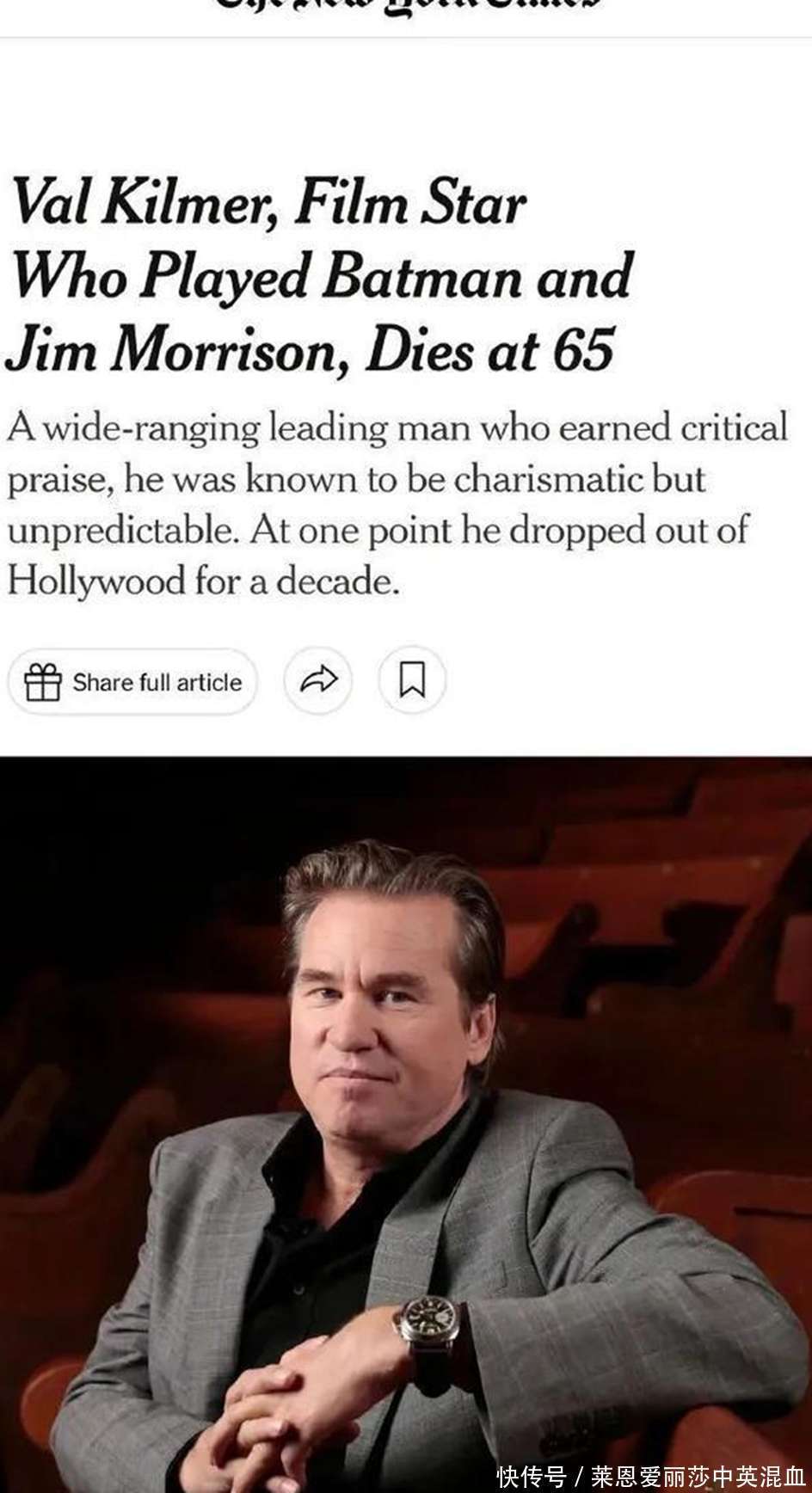 方·基默的业绩岑岭那亦然异常珍爱的。他的影视作品得到了不少的认同,就像MTV电影奖的提名。1991年,他凭借《大门》入围最好男演员,1994年又凭借《墓碑镇》同期提名最好男演员和最性感男演员。这一连串的提名可不是随机的,这是他演技的实力解释。而且他在1995年的时候,在《长期的蝙蝠侠》里扮演“蝙蝠侠”布鲁斯·韦恩,同庚还和稠密巨星主演了《盗火线》。这就像是一场演艺界的全明星盛宴,他能参与其中而况推崇出色,足以看出他的实力。