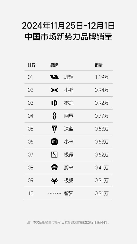 算作参考,2024年第47周(11.18-11.24)中国市集新势力品牌销量前超越别为:理念念(1.16万)、零跑(0.91万)、问界(0.75万)、小鹏(0.72万)、极氪(0.62万)、深蓝(0.61万)、小米(0.46万)、蔚来(0.40万)、极狐(0.28万)和阿维塔(0.23万)。