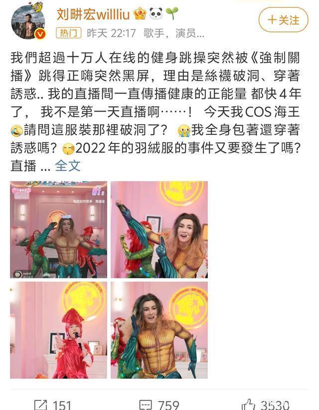 不得不说,这一次王蓉一公就被淘汰,实在让一众网友很不适意,要知说念有实力的被早早淘汰,这也太让东说念主惘然了。 4、刘畊宏直播跳健身操直播间被封,发文回话激发网友热议 昨天晚上,刘畊宏又开启了健身直播,关联词这一次,直播只是保管几十分钟,直播间俄顷被封。