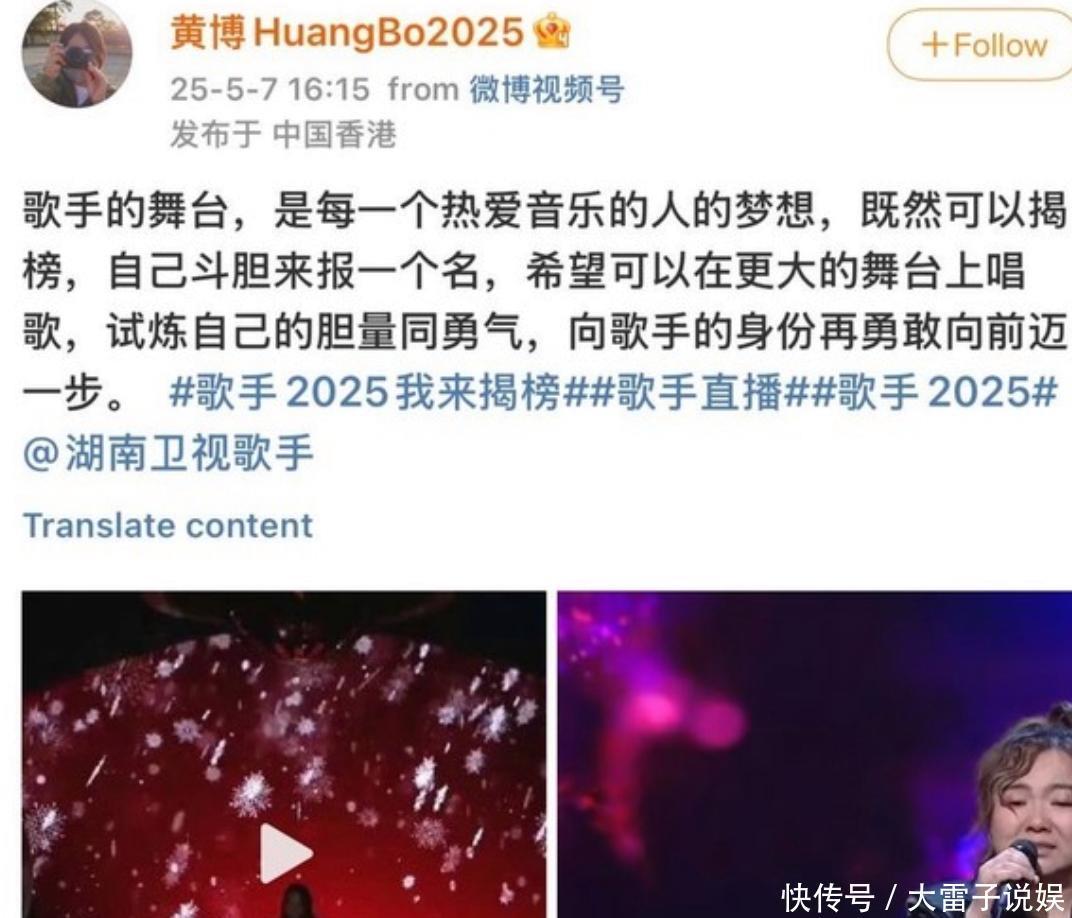 黄博还在个东谈主酬酢账号书记了报名的决定。帖文中称,登上《歌手》是趣味音乐的东谈主的梦思,我方但愿站在更大的舞台上唱歌,何况不断考研胆量和勇气,向歌手的身份勇敢迈进。下图为黄博帖文截图: