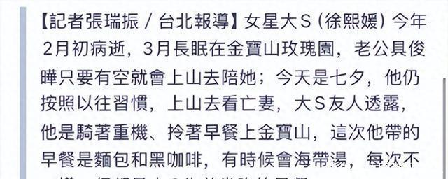 而这一次,具俊晔还为大S带了她最爱吃的早餐,面包和黑咖啡,传奇,具俊晔每次上山给大S带的早餐不重样,偶而代是海带汤,齐是大S生前爱吃的。此前有报谈称,具俊晔和大成亲后早上变着法的为大S作念爱心早餐。