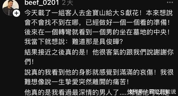 回到具俊晔七夕节去看守大S这件事上,有网友奖饰他深情,有网友吐槽他造假,实质上,无论外界如何说,具俊晔好像在大S离世后,每每探望,并莫得东谈主走茶凉,足见他对大S是嗜好的。我深信具俊晔不会拿大S来为我方立东谈主设。况且具俊晔一直以来从来莫得在网上发声标榜我方,或为我方讲授。