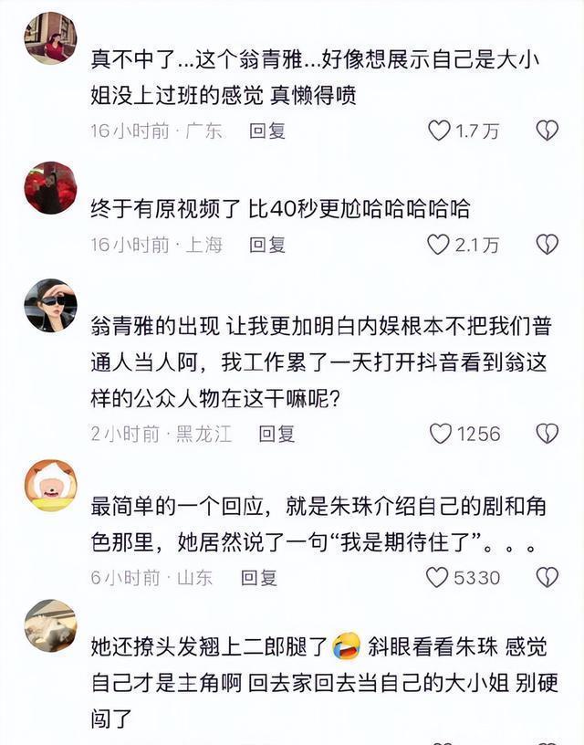 你见过侦查刚开场就堕入寡言长达八秒,主抓东说念主恭候嘉宾救场吗? 翁青雅的ego太大了,她太在乎我方的外型,全程不休调整坐姿,拨弄头发,嘴里说不出几句圆善的话。 看成代表服装品牌的主抓东说念主,称号“时装周的行径”为“时装周那些东西”,大长宗旨! 博物洽闻的朱珠也有点坐不住了,她用目光求救:“这节目作念成这样,不错交差吗?” 东说念主在无语的期间即是会笑的。 看,翁青雅无语的期间,老是给我方一个甜好意思的笑脸看成饱读动呢! 她倒是对我方挺好的,不苛责我方。 难为场外的打工东说念主,这几分钟的时辰里,怕是依然东说念主仰马翻,到处想方针看怎么救场。 这不,请上来一个穿着王人没换的女孩磋磨帮翁青雅一把。