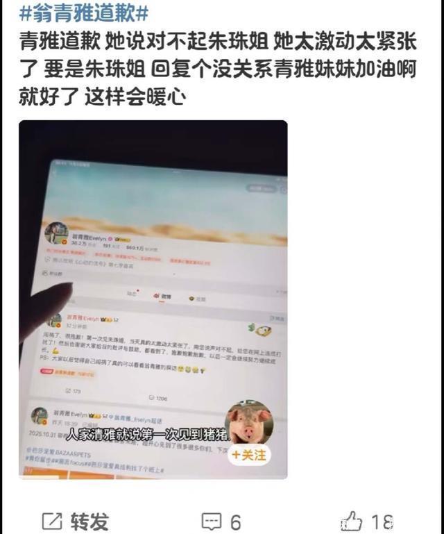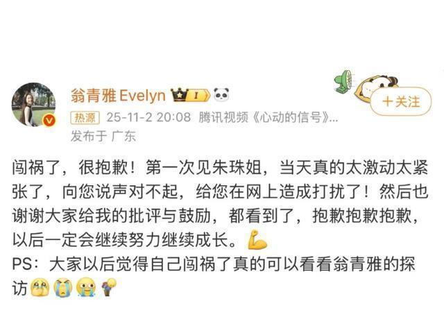 这个视频在集聚上发酵后,最茶的一Part来了! 视频激发全网探讨后,翁青雅在社媒发文说念歉,全文如下: “肇事了,很对不起!给您变成惊扰了,以后一定会不绝悉力不绝成长。”