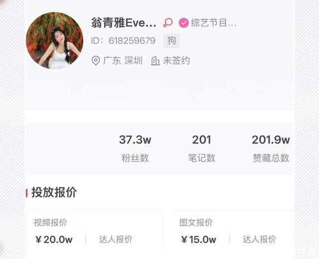 原因很浮浅,翁青雅算是小网红,自带流量。 她在小某书的视频报价也到了20w级别,主抓这场行径品牌方支付的用度应该在30w到50w。