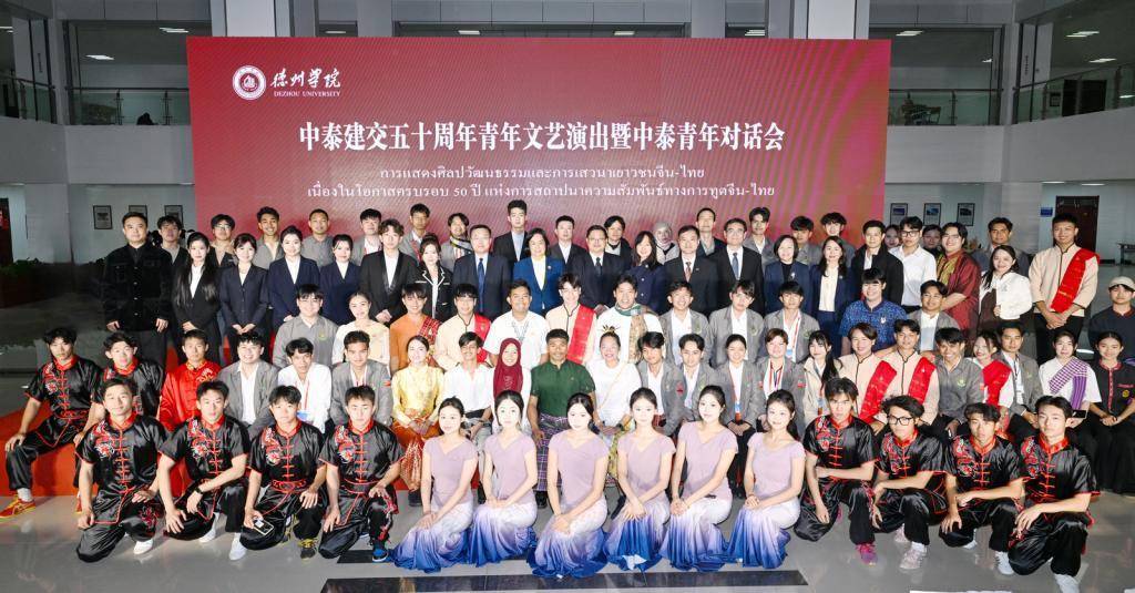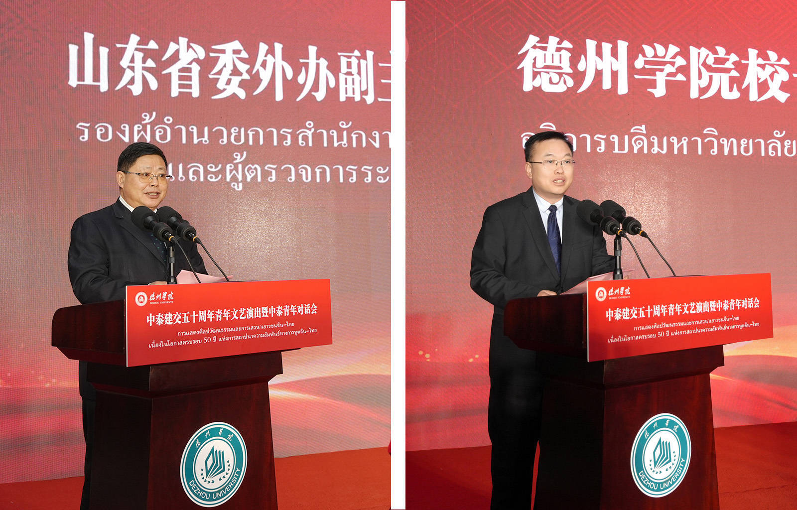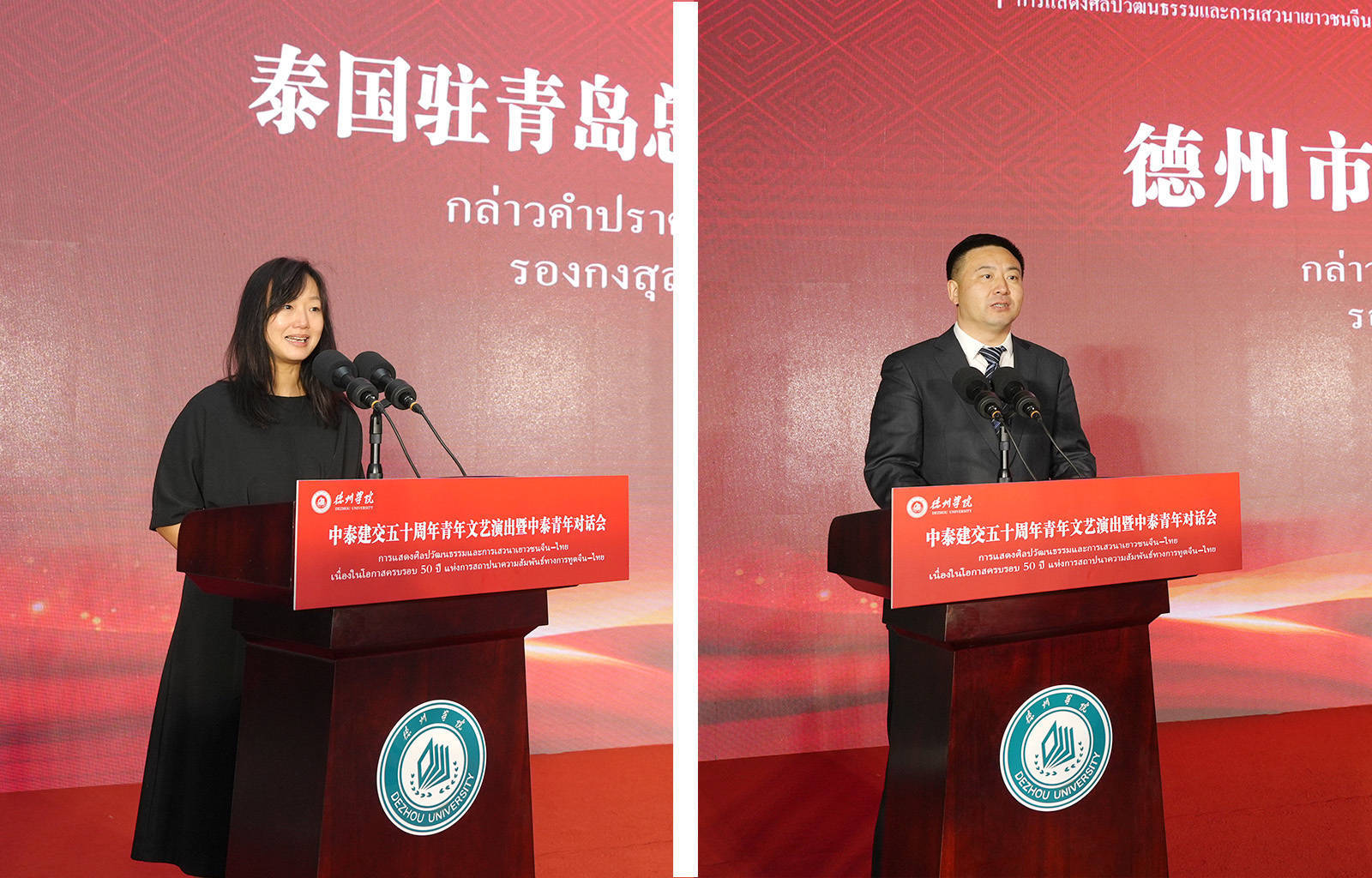 11月3日,一场承载着中泰两国半个世纪友谊的庆祝作为在德州学院拉开帷幕。泰王国驻青岛总领事馆副总领事金清清,泰国前上议员、泰国七世王学院大学生基金会副主席兼秘书长说念诺·苏提尼帕潘,中国驻泰国大使馆参赞袁锐东,山东省委外办副主任、一级查看员孙业宝,山东省委外办亚洲处副处长、二级调研员王绍兵,德州市副市长陈海明,学校党委副布告、校长赵长林等嘉宾与53东说念主构成的泰国拉玛七世王学院后生代表团都聚一堂,共赴“中泰联袂五十载,锤真金不怕火齐心向异日”的文化与锤真金不怕火交流盛宴。